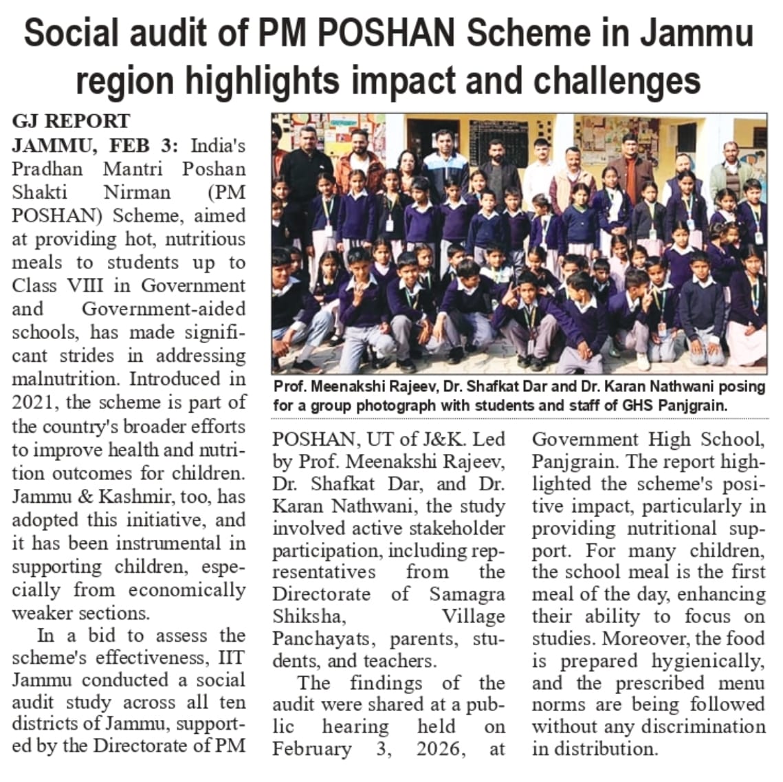 India has implemented various nutrition-centric and nutrition-sensitive programs to address malnutrition and promote better health outcomes. Pradhan Mantri Poshan Shakti Nirman (PM POSHAN) Scheme is one of the foremost rights-based Centrally Sponsored Schemes implemented in partnership with the States and UTs for providing one hot cooked and nutritious meal to all children up to class VIII of Government and Government-aided schools. The PM Poshan Shakti Nirman (PM POSHAN) Scheme, earlier known as the ‘National Programme for Mid-Day Meal in Schools’ Scheme, was introduced in 2021. The UT of J & K also adopted this scheme and reaped the benefits of the scheme. To understand the functioning of the scheme in the entire ten districts of Jammu region, IIT Jammu, HSS Department, has undertaken a social audit study led by Prof. Meenakshi Rajeev , Dr Shafkat Dar and Dr Karan Nathwani with the support of the Directorate of PM Poshan of the UT. The study covers all the ten districts of the Jammu Province. A Social Audit is a systematic process through which the implementation, performance, and outcomes of a public programme or scheme are examined with the active involvement of stakeholders.